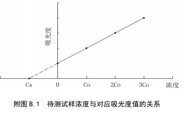 分別量取4等份量待測(cè)試樣(濃度為Cx),配制總體積相同的4份溶液。第一份不加標(biāo)準(zhǔn)溶液,第二、三、四份分別按比例加入不同濃度的標(biāo)準(zhǔn)溶液,4份溶液的濃度分別為:Cx、Cx+Co、Cx+2Co、Cx+3Co,加入標(biāo)準(zhǔn)的最小濃度Co≈0.5Cx。用空白溶液調(diào)零,在相同條件下依次測(cè)定4份溶液的吸光度值。以吸光度值為縱坐標(biāo),加入標(biāo)準(zhǔn)溶液的濃度為橫坐標(biāo),繪制校準(zhǔn)曲線,曲線反向延伸與橫坐標(biāo)的交點(diǎn)即為待測(cè)樣品的濃度。該方法只適用于濃度和吸光值呈線性的區(qū)域。待測(cè)試樣濃度與對(duì)應(yīng)吸光度值的關(guān)系見附圖A.1。