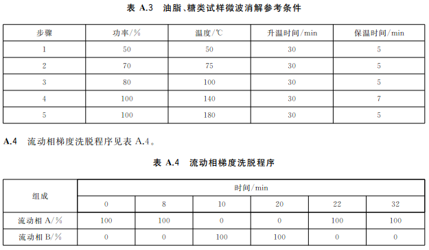 蔬菜、水果等含水分高的樣品,稱取2.0g~4.0g(精確至0.001g)樣品于消解罐中,加入5mL硝酸,放置30min;糧食、肉類、魚類等樣品,稱取0.2g~0.5g(精確至0.001g)樣品于消解罐中,加入5mL硝酸,放置30min,蓋好安全閥,將消解罐放入微波消解系統(tǒng)中,根據(jù)不同類型的樣品,設(shè)置適宜的微波消解程序(見表A.1~表A.3),按相關(guān)步驟進(jìn)行消解,消解完全后趕酸,將消化液轉(zhuǎn)移至25mL容量瓶或比色管中,用少量水洗滌內(nèi)罐3次,合并洗滌液并定容至刻度,混勻。同時(shí)作空白試驗(yàn)。
