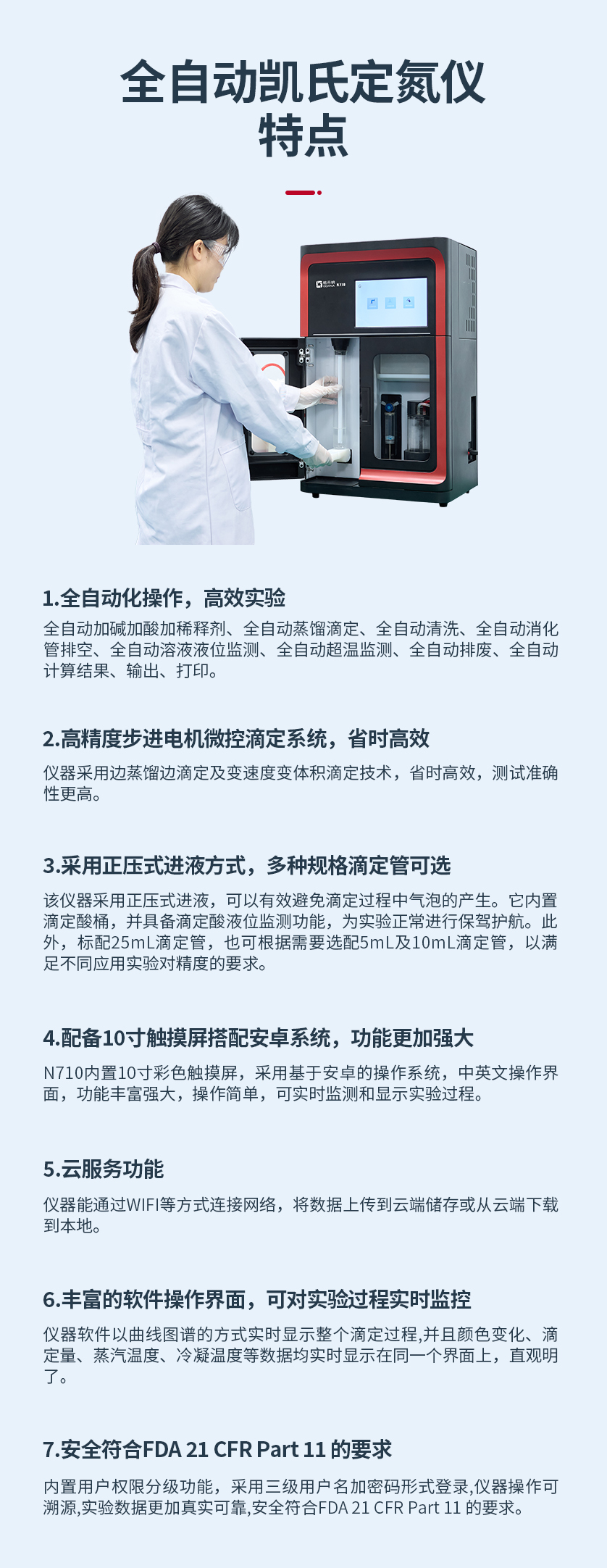 全自動(dòng)加堿加酸加稀釋劑、全自動(dòng)蒸餾滴定、全自動(dòng)清洗、全自動(dòng)消化管排空、全自動(dòng)溶液液位監(jiān)測、全自動(dòng)超溫監(jiān)測、全自動(dòng)排廢、全自動(dòng)計(jì)算結(jié)果、輸出、打印。