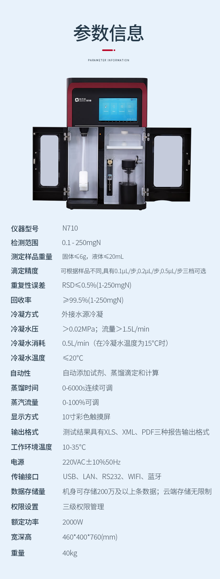 新一代N710全自動(dòng)凱氏定氮儀集成了自動(dòng)加堿加酸、自動(dòng)加稀釋劑、蒸餾滴定、消化管排空、溶液液位監(jiān)測、超溫監(jiān)測、清洗排廢、結(jié)果計(jì)算等功能。采用符合國家標(biāo)準(zhǔn)的凱氏定氮方法:濃硫酸環(huán)境消解樣品、堿性環(huán)境蒸汽蒸餾、硼酸吸收、加指示劑滴定、終點(diǎn)顏色判定法。