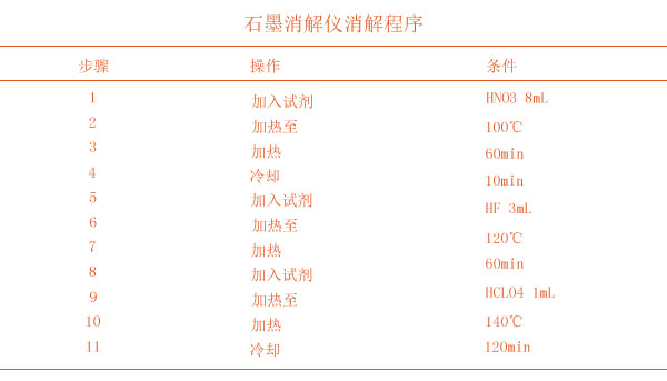稱取試樣0.2~0.5g(精確到0.1mg)于聚四氟乙烯消解管中,將消解管放入石墨消解裝置石墨孔中。設(shè)置消解程序進(jìn)行消解。消解完畢后冷卻至室溫,然后加入硝酸溶液(1+1)1mL溶解殘?jiān)D(zhuǎn)移至50mL容量瓶中,用少量去離子水洗滌消解罐,洗滌液一并轉(zhuǎn)移至容量瓶,同時(shí)測定消解全程空白。智能石墨消解的消解程序下面見表1。