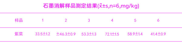采用上述的方法對紫菜(各6份)進(jìn)行測定,測定結(jié)果為3次測定的平均值及標(biāo)準(zhǔn)偏差范圍,結(jié)果見表【石墨消解樣品的測定結(jié)果】。紫菜總砷含量范圍為33.5~72.1mg/kg。