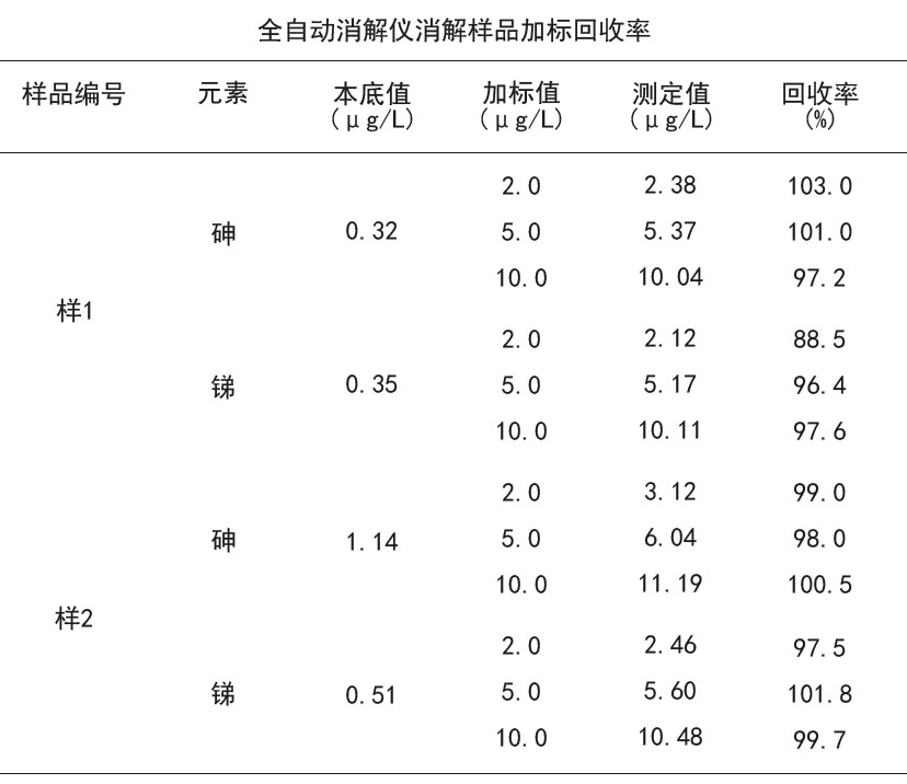 在實(shí)際2份尿樣中加入一定濃度的As和Sb標(biāo)準(zhǔn)溶液,測(cè)定樣品的加標(biāo)回收率,結(jié)果為As的回收率在97.2~103%之間,Sb的回收率在88.5~101.8%之間,見(jiàn)下表。