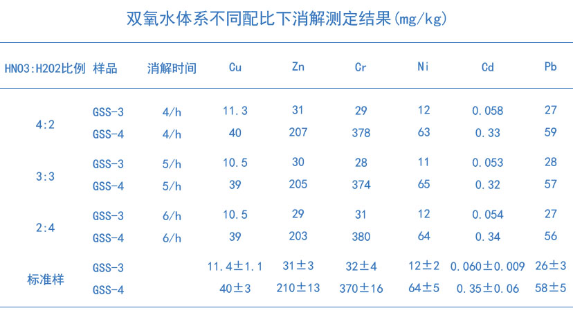通過(guò)硝酸和雙氧水不同配比下的消解,對(duì)比兩種消解酸體系的實(shí)驗(yàn)結(jié)果如下表。由表中數(shù)據(jù)可知,硝酸-氫氟酸-雙氧水體系均可以滿足銅、鋅、鉛、鎘、鉻、鎳6種重金屬元素的測(cè)定,而配比為4:2的體系消解時(shí)間更短,加入過(guò)氧化氫的次數(shù)少,這是因?yàn)檫^(guò)氧化氫的氧化能力隨介質(zhì)的酸度增加而增加,在HNO3:H2O2配比為4:2的配比下,氧化效率更高,確定該比例為佳比例。