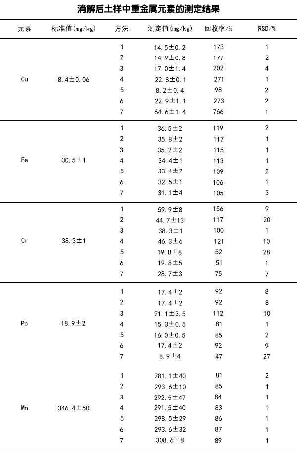 討論:不同類型的土壤中重金屬含量有較大差異,不同消解方法對(duì)重金屬含量分析的影響也有差異。文中選用的7種消解方法對(duì)標(biāo)準(zhǔn)土樣Cu、Fe、Mn、Pb、Cr含量的測(cè)定值顯示,只有Fe、Mn含量的測(cè)定值在標(biāo)準(zhǔn)值范圍內(nèi),Cu含量在HCIO4蒸干的條件下測(cè)定值不在標(biāo)準(zhǔn)范圍內(nèi),Pb含量在HNO3蒸干、HF蒸干、HClO4蒸干以及HNO3、HClO4同時(shí)蒸干、HNO3、HF、HClO4同時(shí)蒸干的條件下測(cè)定值不在標(biāo)準(zhǔn)范圍內(nèi),Cr含量在只有HClO4蒸干的條件下測(cè)定值在標(biāo)準(zhǔn)值范圍內(nèi)。