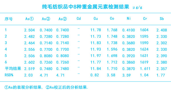 面對紡織品重金屬的危害,國家也制定了標準GB/T1759321998《紡織品重金屬離子試驗方法-原子吸收分光光度法》,在本次實驗中我們采用實驗電加熱板+HNO3+HClO4濕法消化法處理來消解樣品,分析純毛紡織品中的8種重金屬元素Pb,As,Cd,Co,Cu,Ni,Sb,Cr的影響,為紡織品行業(yè)檢測提供經(jīng)驗。