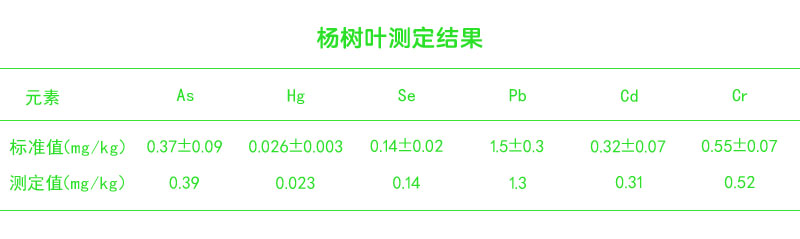 對國家標(biāo)準(zhǔn)物質(zhì)楊樹葉按以上實(shí)驗(yàn)電熱板濕化消解的方法處理后,按上述分析條件分別進(jìn)行多次檢測,并用一次消解進(jìn)行多種重金屬檢測共7次的結(jié)果。
