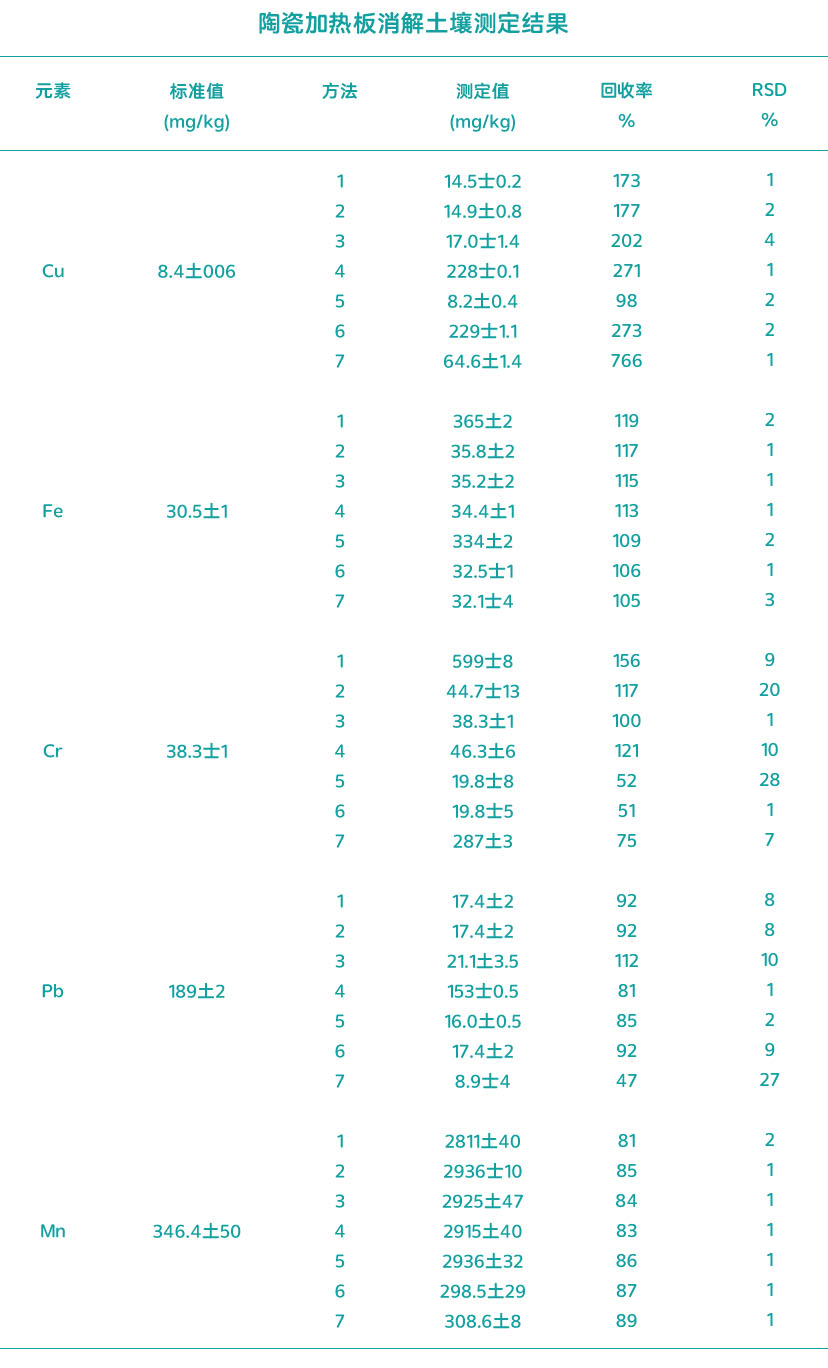 實(shí)驗(yàn)中采用新型陶瓷加熱板對(duì)土壤進(jìn)行HNO3+HF+HCLO4酸體系消解方法,消解過程中對(duì)不同酸量的控制,觀察分析土壤中重金屬的不同影響,方法僅供參考。新型陶瓷加熱板大加熱面積有助消解使用批量處理,遠(yuǎn)程數(shù)控控制器精準(zhǔn)對(duì)溫度進(jìn)行調(diào)控,擺脫傳統(tǒng)電熱板的費(fèi)時(shí)多、低效率的操作。