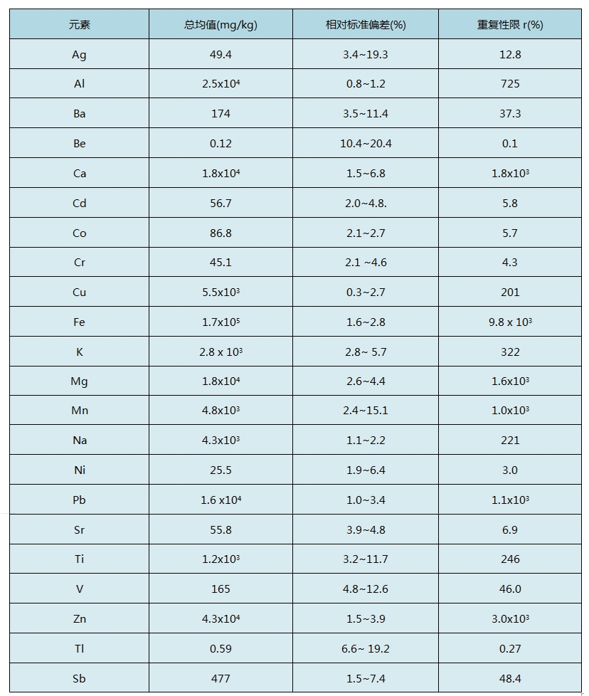 從表中看出相對(duì)標(biāo)準(zhǔn)偏差范圍分別為:1.1%~22.6%,數(shù)據(jù)可靠,符合實(shí)驗(yàn)室對(duì)固廢消解要求。