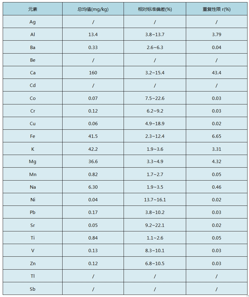 采用固廢消解步驟五中的方法對(duì)固體廢物中22種金屬元素浸提液標(biāo)準(zhǔn)樣品ISS-2樣品進(jìn)行消解,經(jīng)過(guò)6次測(cè)定分析得出精密度結(jié)果如下表: