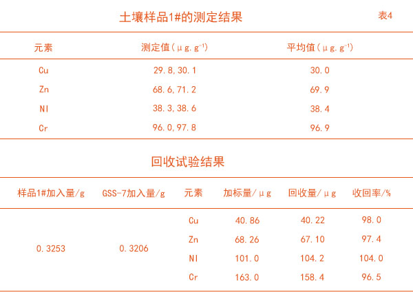 將土壤樣品1#按照消解步驟消解后進(jìn)行ICP–OES測定。然后將土壤樣品1#與GSS–7質(zhì)控樣以質(zhì)量比1∶1左右進(jìn)行加標(biāo)回收試驗(yàn),測定結(jié)果見表4。從表中結(jié)出各元素回收率在96.5%~104.0%之間,滿足分析要求。
