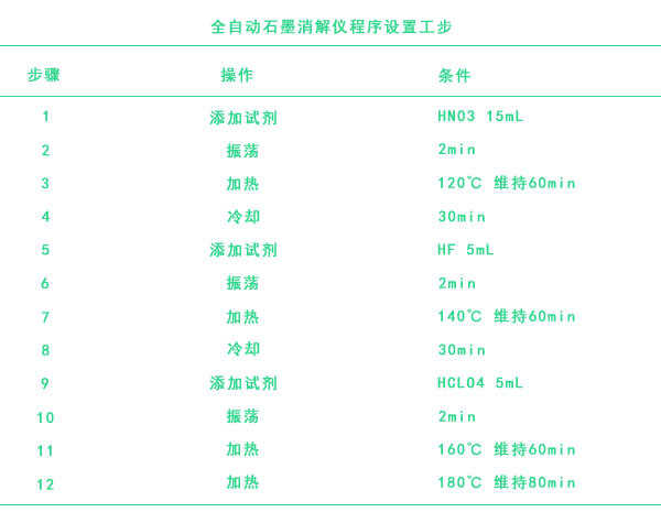 (2)全自動(dòng)消解儀消解法具有操作簡(jiǎn)便、程序自動(dòng)化、無需人員值守等優(yōu)點(diǎn)。本實(shí)驗(yàn)中全自動(dòng)消解儀消解法采用HNO3+HF+HClO4體系,為研究實(shí)驗(yàn)提供經(jīng)驗(yàn)。