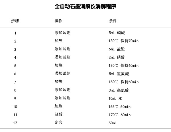 準確稱取0.50g樣品,放置聚四氟乙烯消解管中,然后插入全自動石墨消解儀石墨孔中,加入5mL硝酸,加熱到130℃,維持70min;加入6mL鹽酸、2mL硝酸,130℃加熱60min;加入5mL氫氟酸,加熱到150℃,維持60min,加入3mL高氯酸、10mL純水,加熱到155℃,維持50min,后趕酸,并自動定容至50mL,搖勻待測。(具體全自動消解儀消解程序見下面表格)。同時進行試劑空白試驗。