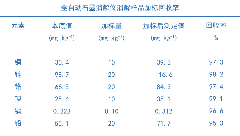 格丹納全自動(dòng)石墨消解儀對(duì)土壤樣品消解方法加標(biāo)測(cè)定回收率結(jié)果如下表: