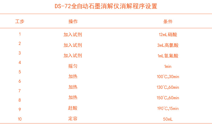 加入12mL硝酸+3mL高氯酸+1mL氫氟酸,搖勻1min,然后程序自動(dòng)升溫至100℃,保持30min,此時(shí)消解管中有濃重的紅棕色煙霧冒出,繼續(xù)消解樣品將溫度升溫至130℃,保持60min,溫度升溫至150℃,保持60min,到時(shí)的樣品應(yīng)該消解至淡黃色澄清透明狀態(tài),全自動(dòng)石墨消解儀升溫至190℃,保持15min進(jìn)行趕酸,趕酸完全后使用超純水定容至50mL待測(cè)。同時(shí)做空白樣試樣。