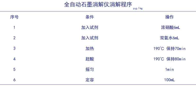 《中國(guó)藥典》中有規(guī)定了中藥中鉛、鎘、砷、汞、銅的檢測(cè)方法,對(duì)于沙星類抗生素中的其它金屬元素殘留未作規(guī)定。本文采用全自動(dòng)石墨消解儀酸消解方法對(duì)樣品進(jìn)行前處理消解,測(cè)定左氧氟沙星膠囊中鉛、鉻、砷、鎘、錫、鋁、鐵7大金屬元素含量。消解儀高程度自動(dòng)化消解,操作簡(jiǎn)單、批處理量大,解放人力繁瑣操作,大大提高工作效率。